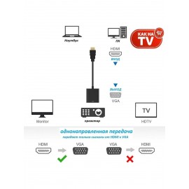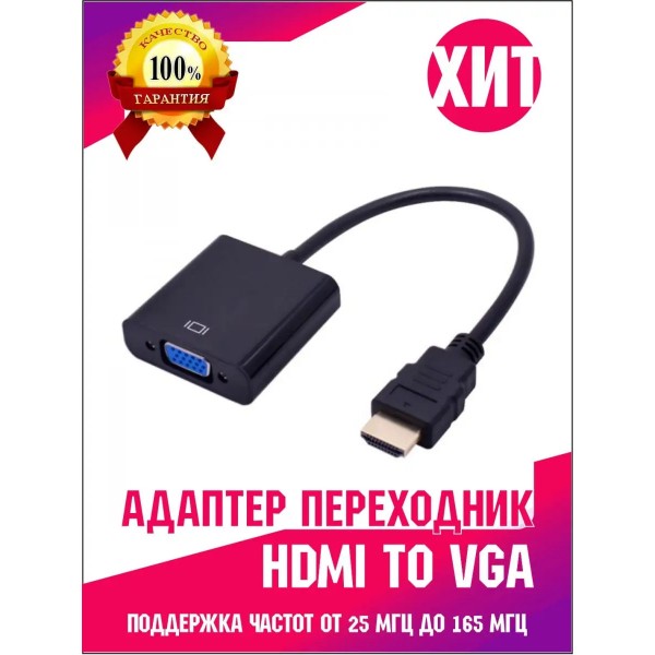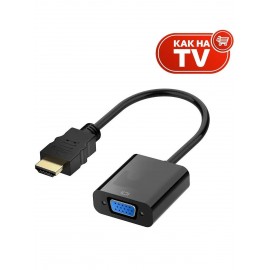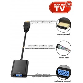 Адаптер переходник HDMI to VGA Adapter (Черный) – внешнее устройство, способное передавать видеосигнал отличного качества, относится к стандарту 15-pin и оснащено разъемами VGA (F) и HDMI (Male). Длина рассчитана на контактное соединение в пределах 20 сантиметров между разъемами. Адаптер цифрового сигнала HDMI в аналоговый сигнал VGA, позволяет подключить любое устройство с разъемом HDMI, например, ноутбука с устройством использующем аналоговый VGA-сигнал, например, телевизор. Адаптер оборудован в разъем HDMI и разъем VGA 15 PIN.