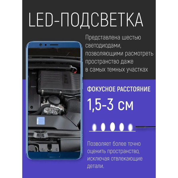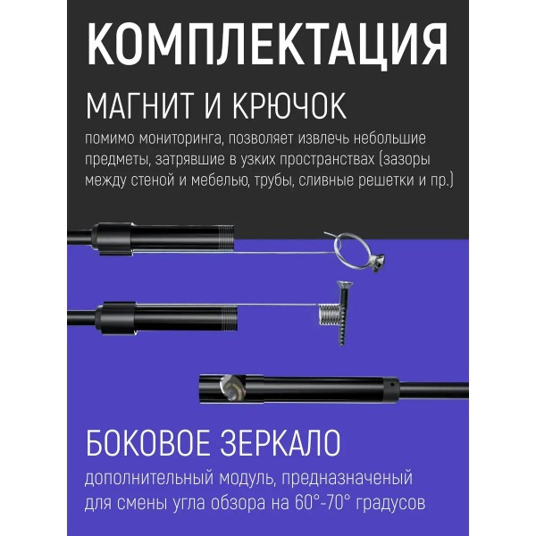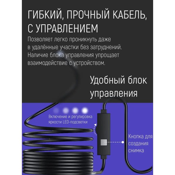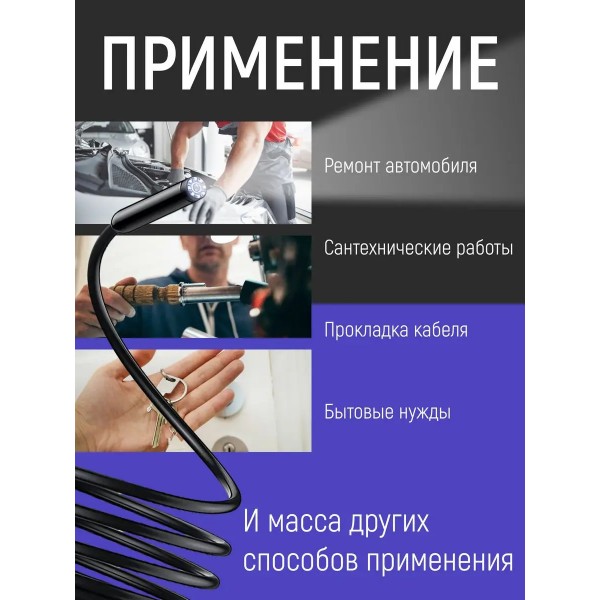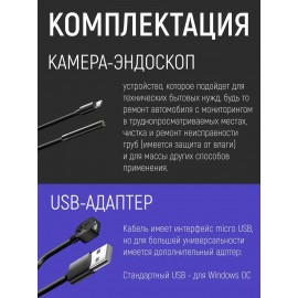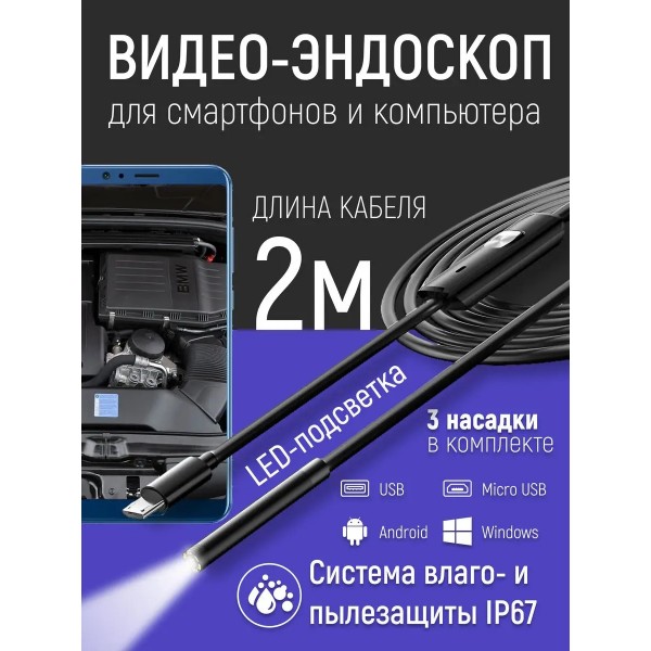Эндоскоп пригодится многочисленным категориям потребителей для осмотра труб, ремонта транспортных средств, автомобилей, оборудования, при монтаже и ремонте различных инженерных систем, строительстве, для рыбалки на небольшой глубине, для работы лабораторий и мастерских по ремонту различного бытового оборудования и авто. Эндоскоп поворотный имеет мягкий зонд, который позволяет проникать в труднодоступные участки. Видеоэдоскоп с гибкой миникамерой можно использовать как инструмент для скрытого наблюдения за животными, в том числе подводными, поскольку устройство имеет водонепроницаемый корпус. Технический эндоскоп используется с любыми смартфонами android и компьютерами с системой windows, разрешение mini камеры 640 x 480. Длина зонда 2 метра. Переходник micro USB - USB (в комплекте), переходник micro USB - Type C (в подарок). Для работы эндоскопа, ваш смартфон должен поддерживать функцию OTG (для проверки скачайте приложение USB OTG CHECKER) и подключение внешней камеры, а система должна быть Android 4.0 и выше. Если ваш смартфон поддерживает работу с внешними камерами, то ставьте приложения из списка в описании ниже и уменьшайте разрешение экрана, пока не подберете совместимый режим работы. Это индивидуальные особенности смартфонов. Совместим с Windows 2000, XP, Vista, 7, 8, 10. Лучшие приложения для подключения эндоскопа: ANCAMERA, OTG View, OTG View Wireless\*,\* Wi-Fi View\*,\* USB Camera\*,\* AN98\*,\* CameraFi\*,\* Endoscope Camera Pro.Гибкая камера, водонепроницаемый бороскоп. Гибкая видео-камера USB Endoscope использовать гибкий очень просто. Ваша задача установить нужный драйвер на компьютере или телефоне, подключить USB к гаджету и приступить к осмотру необходимого объекта. Порой нужные объекты имеют сложную геометрию, например, электрический двигатель, турбогенератор, теплообменник, труба водоснабжения и так далее. Гибкий стержень. Гибкая видеокамера автомобильный USB Endoscope Android 2 мегапикселя.