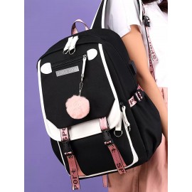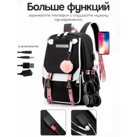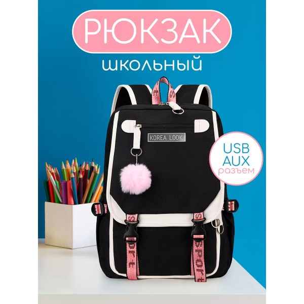 Дизайнерский рюкзак KOREA LOOK с помпоном. Подходит для городского стиля, для школы и спорта. В комплект входит USB и AUX кабель. Стильный рюкзак станет любимым дополнением к образу школьника!