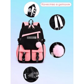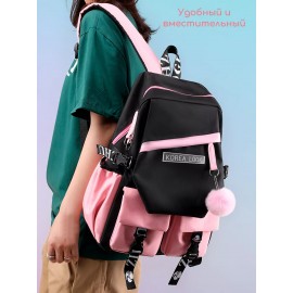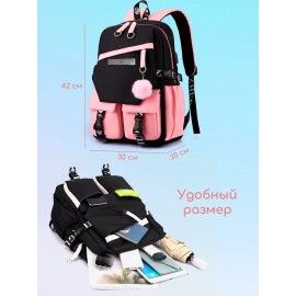 Городской школьный рюкзак KOREA LOOK с помпоном ДВА КАРМАНА для учащихся (Розово-Черный)
