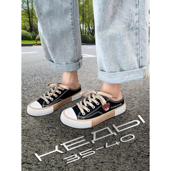 Кеды с вышивкой Медвежонка на плоской подошве из холщовой ткани повседневные кроссовки в корейском стиле (Черные) размер 39
