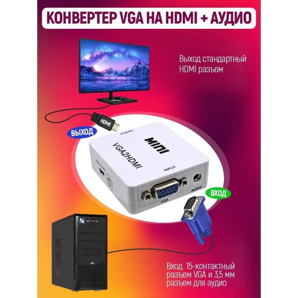 Конвертер VGA на HDMI + аудио, 1080P, VGA 2 HDMI для монитора, PS3, PC Этот мини-HDMI для VGA конвертер позволяет подключить любое устройство, имеющее выход HDMI для подключения VGA-монитора , VGA TV проектора.