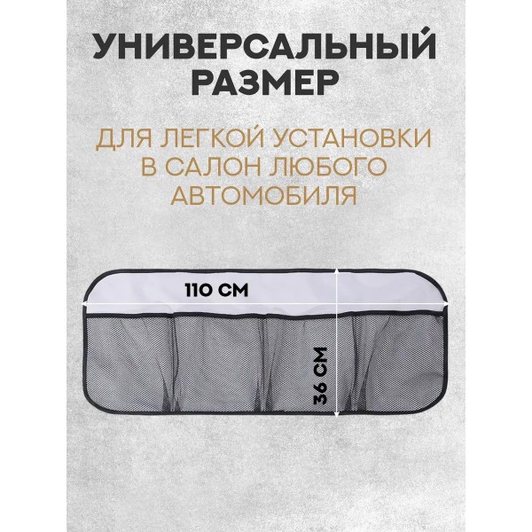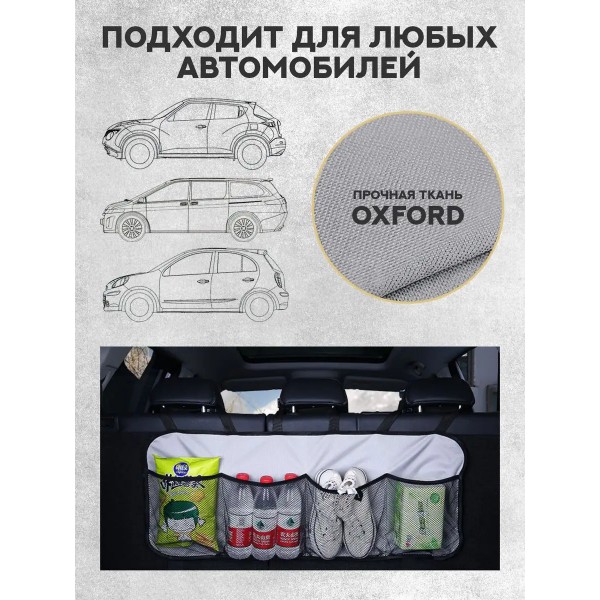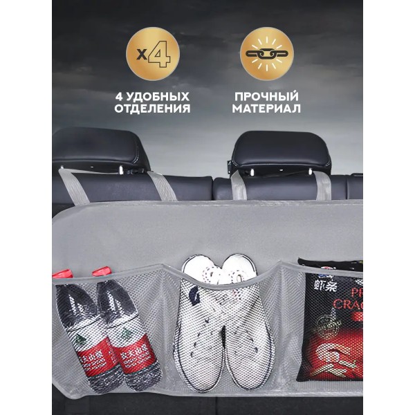 Органайзер в багажник для хранения автомобильных аксессуаров, жидкостей и инструментов. Аксессуар в салон и багажник поможет Вам компактно и аккуратно разместить большое количество вещей в одном месте. Бокс с карманами из ткани в виде сетки станет альтернативой сумкам, контейнерам, дорожным саквояжам, чемоданам и ящикам. Предназначен для крепления на спинку заднего сидения.