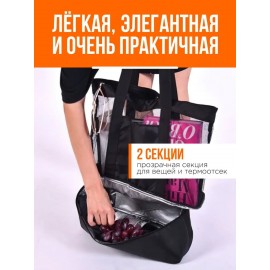 Пляжная термо-сумка холодильник 2 в 1. Термосумка холодильник имеет 2 секции: прозрачная секция для вещей и скрытая секция (термоотсек) для ценных вещей, мокрых купальников или напитков/продуктов, которые необходимо содержать в прохладе. Сумка лёгкая, элегантная и очень практичная, легко очищается изнутри и быстро сохнет!
